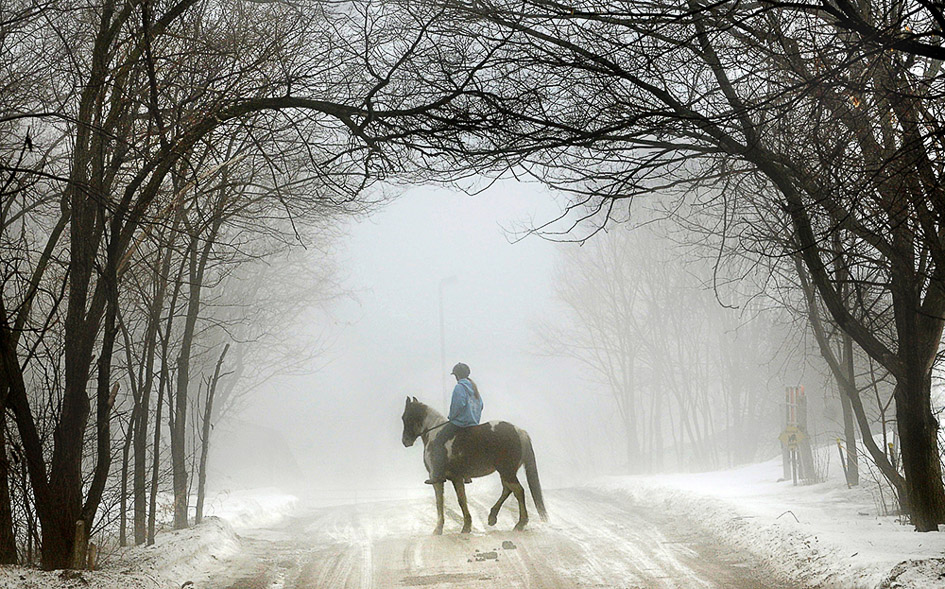"It's gorgeous out here. I love the fog," said Jenny Tolbert of Woodbury, who rides Newton, a 10-year-old Paint, one of about 50 horses she keeps at the Windy Ridge Ranch, in Woodbury on Thursday. "I love to look at them out the kitchen window, but I couldn't see any of them today through the fog," she said. "Today was supposed to be housework day, but this is much more pleasant than cleaning, for sure."